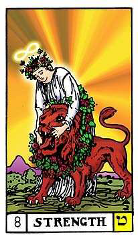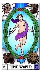 The female figure in the centre holds two wands in her hands indicating that she holds both the directions of the life-force in balance, the creative and decreative aspects, the ‘buffets’ and ‘rewards’ of Fortune spoken of earlier, the movements upwards and downwards on the Tree of Life. She has a banner of purple, representing ‘majesty’ or ‘kingship’, moving in the TARO direction (from The Wheel of Fortune) indicating that she has mastery over the influences of the heart, body, mind and soul. The illustrator of the cards has chosen to include the four evangelists in this card as they are presented in The Wheel of Fortune. These are not necessary for the figure herself has achieved the position of being both in Time and out of Time simultaneously and she is capable of the gift of prophecy herself. It is interesting to note that the last letter of torah is Heh meaning ‘jubilation’, while the last letter of tarot is Tav meaning ‘good’. Both indicate a joy in the completion of the journey and both are possible ways of completing the journey.