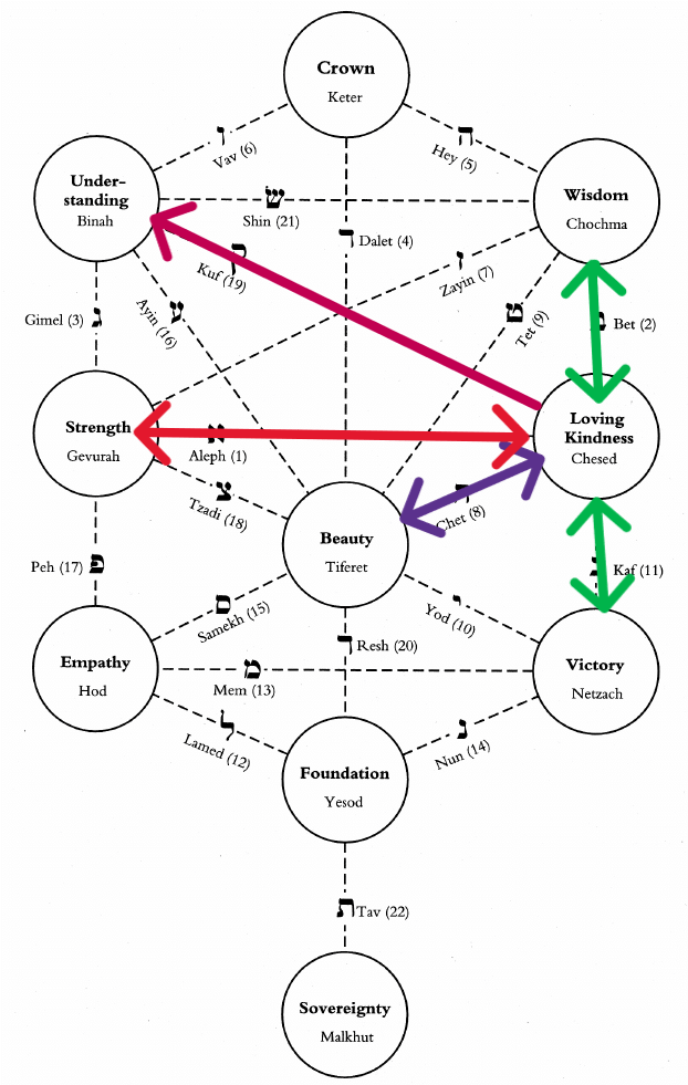 The 32nd path, along with the 30th and 31st paths are the outline or nexus of the realm of Necessity. All created things must “serve” the law of Necessity whether it be seen as the force of gravity or those forces which operate within the realm of social interactions. The Law of Necessity is the Divine Will. The 32nd path is also a warning to those who are unable to distinguish between the Necessary and the Good because those who are unable to do so usually worship power.